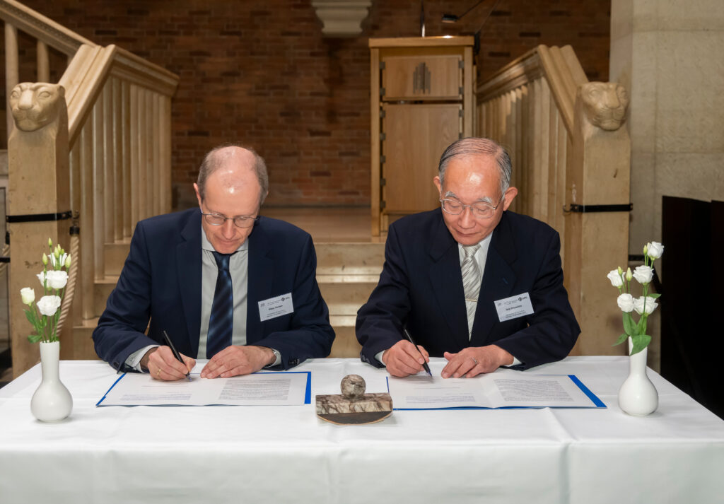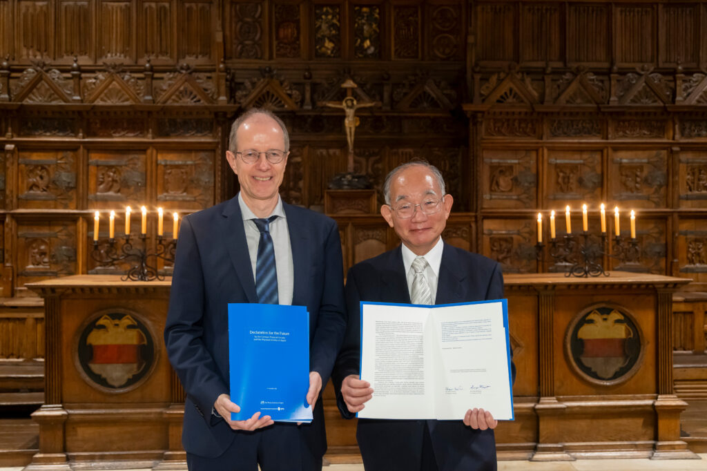 2025年11月14日 ドイツ ミュンスター市庁舎において、ドイツ物理学会 Klaus Richter(クラウス・リヒター)会長、日本物理学会 宮下精二会長による共同宣言「未来への宣言」署名式が執り行われました。